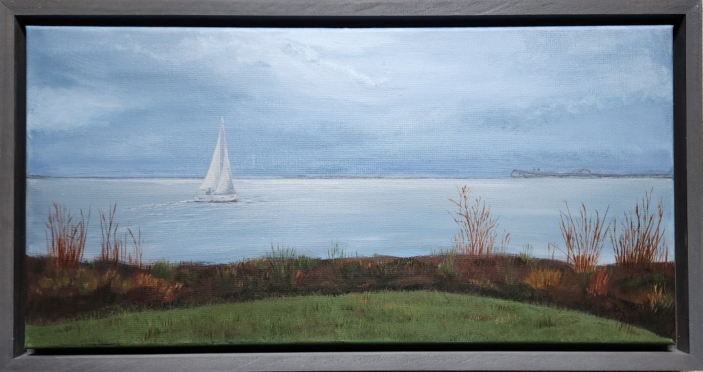 Such a lovely way to end the day on the waters of the Chesapeake Bay, The Sailboat (2022) 12″ x 22″ framed