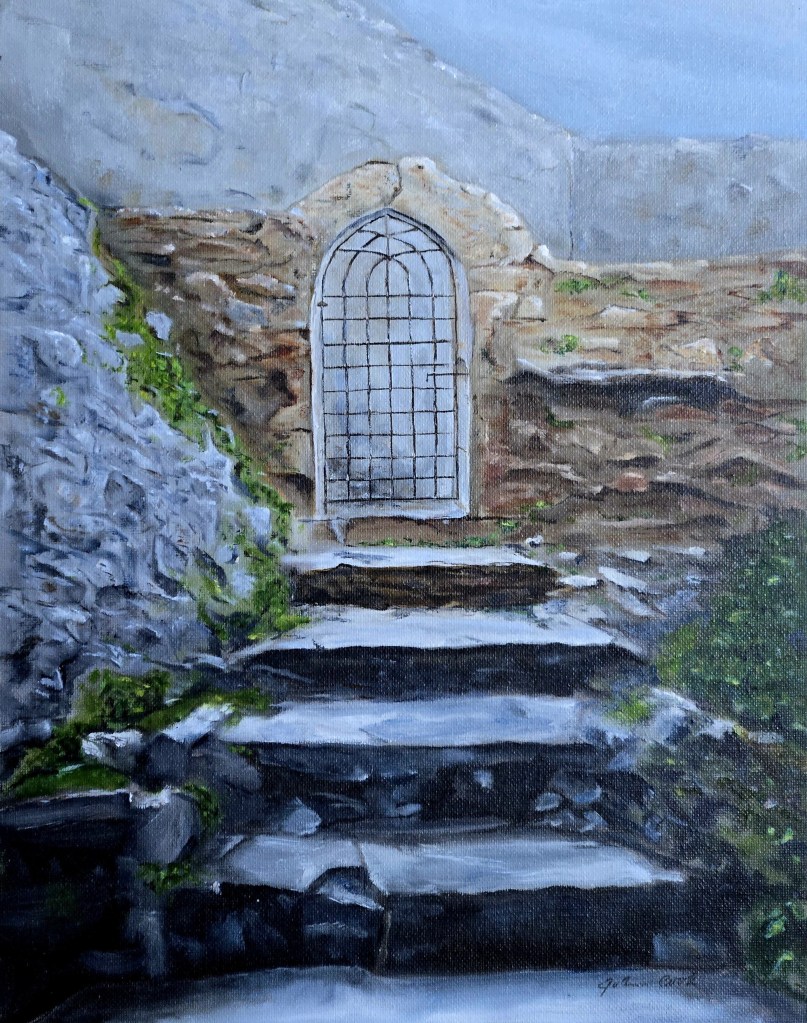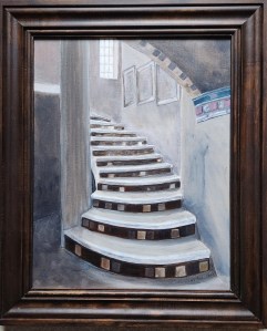 Welcome to my Castle (2022) Oh, I wish! This painting is inspired by one of the many staircases at Fonthill Castle. 14″ x 17″ framed