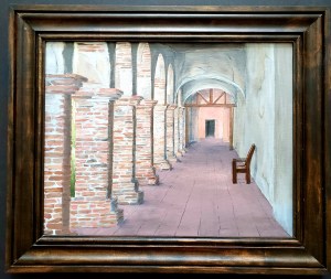 A thoughtful walk, a solitary chair at Mission San Juan Capistrano (2022) 14″ x 17″ framed