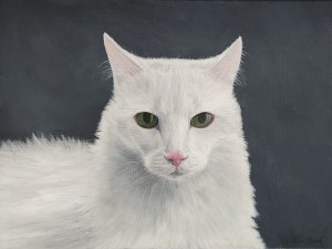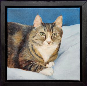 My Sister’s Kitty (2022), is the first animal I painted as a surprise for my sister. I didn’t realize there would be other kitties to paint when I titled this painting. 10″ x 10″ framed