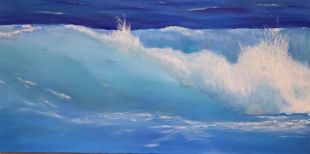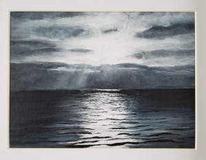 Is it the sun or moon, evening or morn? Tranquility can be what you want it to be. I was inspired by a photo I saw (details below) and it’s what I wanted to paint when I was no longer intimidated by a plain white canvas and when I felt comfortable enough to go beyond instructor-chosen subject matter. I consider this my first painting (2021), and it’s still my favorite. Credit goes to Gustave Le Gray who produced the original photograph, an albumen print, back in 1856-57. He titled it Solar Effect in the Clouds-Ocean and it is held at the Art Institute of Chicago. 12″ x 16″ framed
