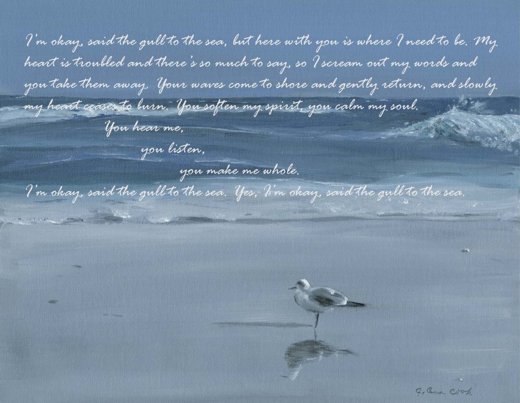 “I’m okay,” said the gull to the sea, “but here with you is where I need to be. My heart is troubled and there’s so much to say, so I scream out my words and you take them away. Your waves come to shore and gently return and slowly my heart ceases to burn. You soften my spirit, you calm my soul. You hear me, you listen, you make me whole.” “I’m okay,” said the gull to the sea. “Yes, I’m okay,” said the gull to the sea. The Gull (2022) 15″ x 19″ framed